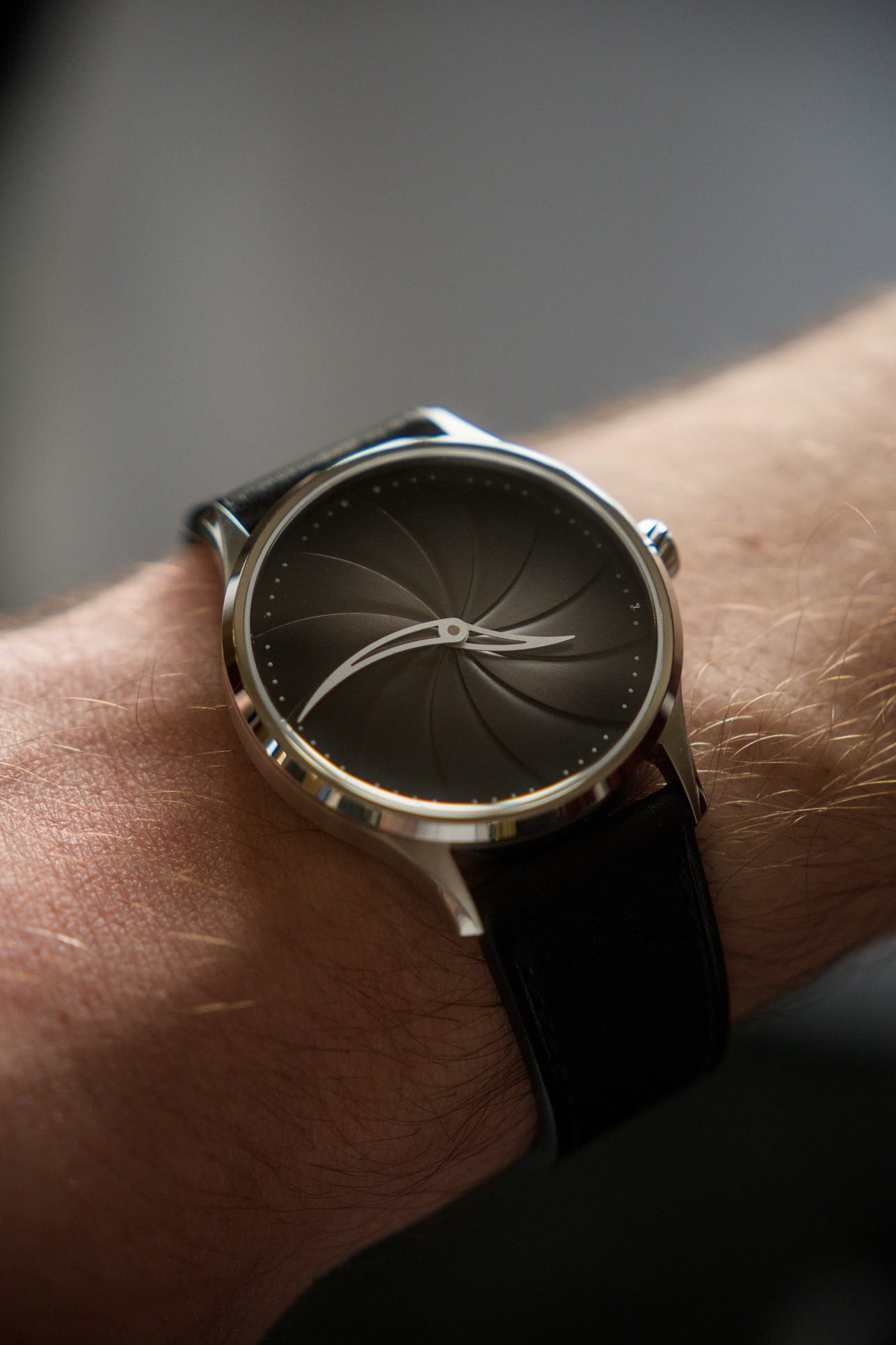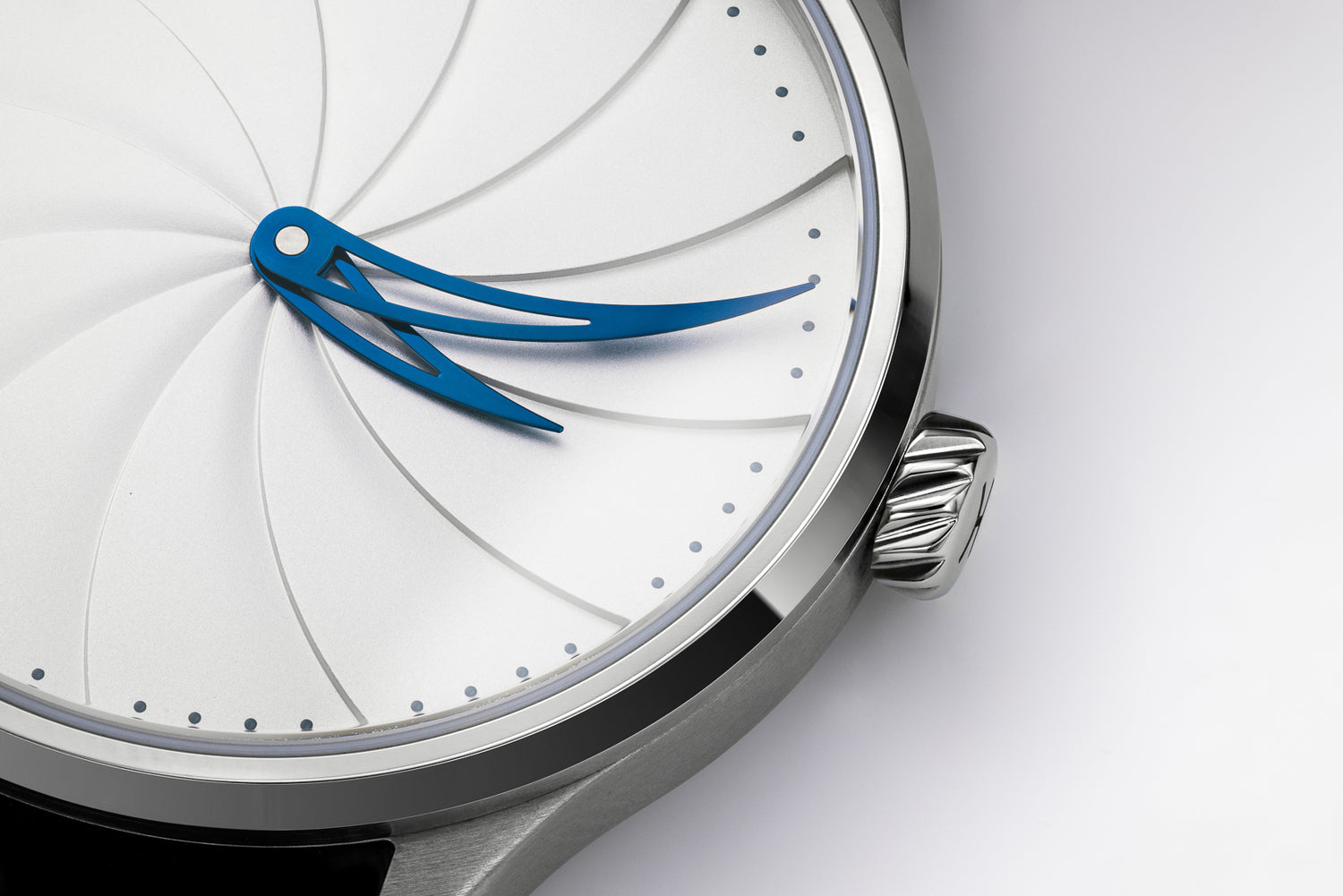The curved skeleton hands hover delicately above the dial’s spiral, echoing its flowing geometry beneath. Depending on the variant, they are either heat-blued steel, shifting from deep navy to flashes of bright blue as light catches their surface, or bead-blasted and rhodium-plated, offering a refined, matte contrast. Each is crafted to complement the depth and finish of the dial.