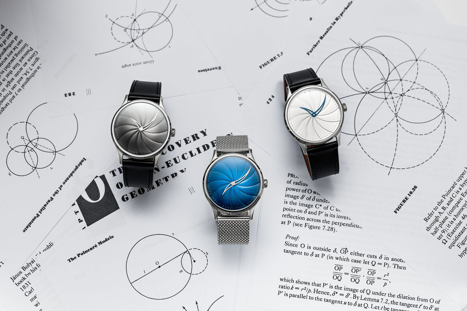The Model 1 draws inspiration from non-Euclidean geometry, where space bends and curves beyond classical rules. On the caseback, a debossed Poincaré disk pays tribute to the 19th-century breakthrough that reshaped our understanding of geometry – and, ultimately, of space-time itself.