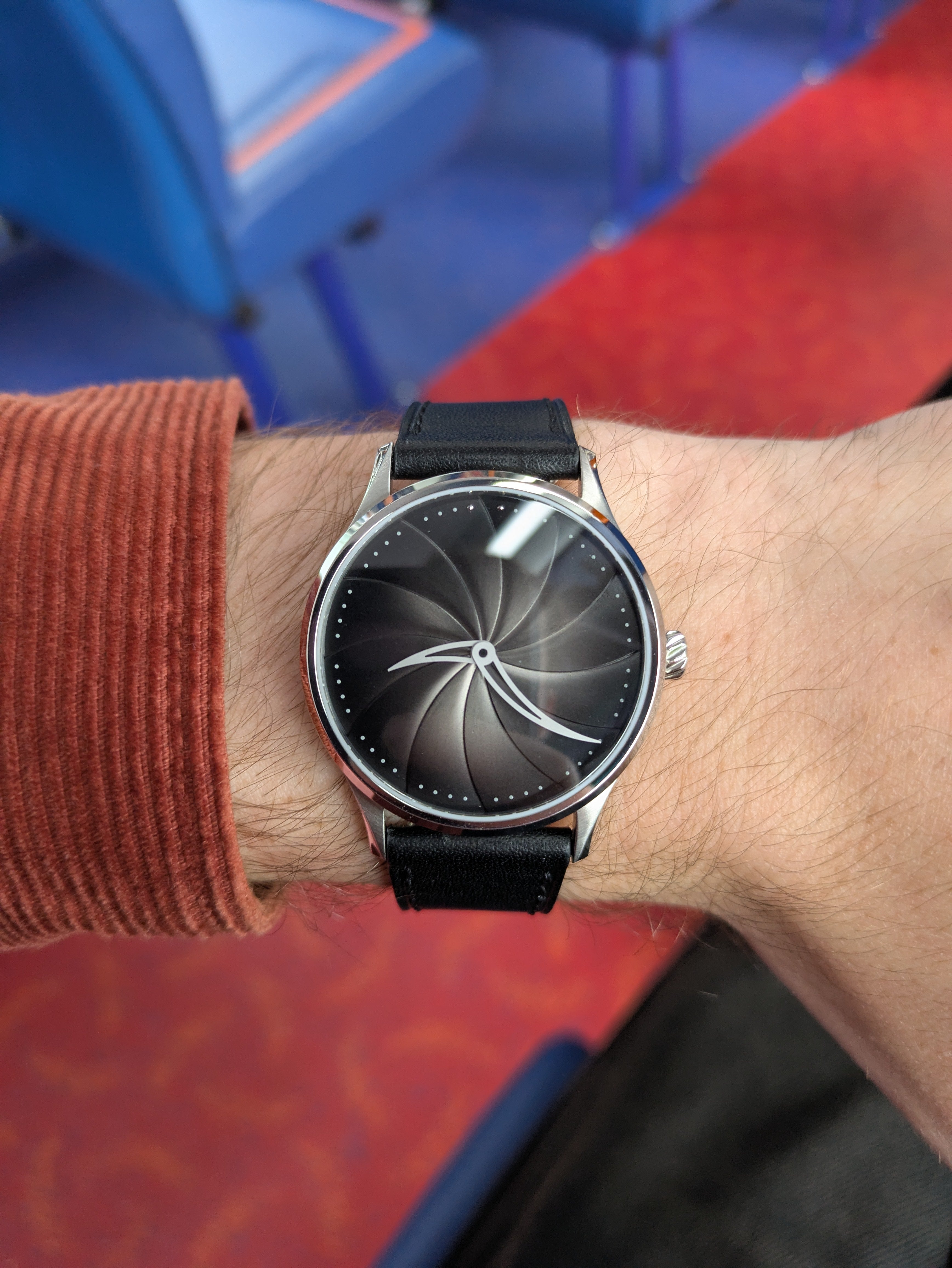 Rhodium-plated hands (on black and blue dial variants).