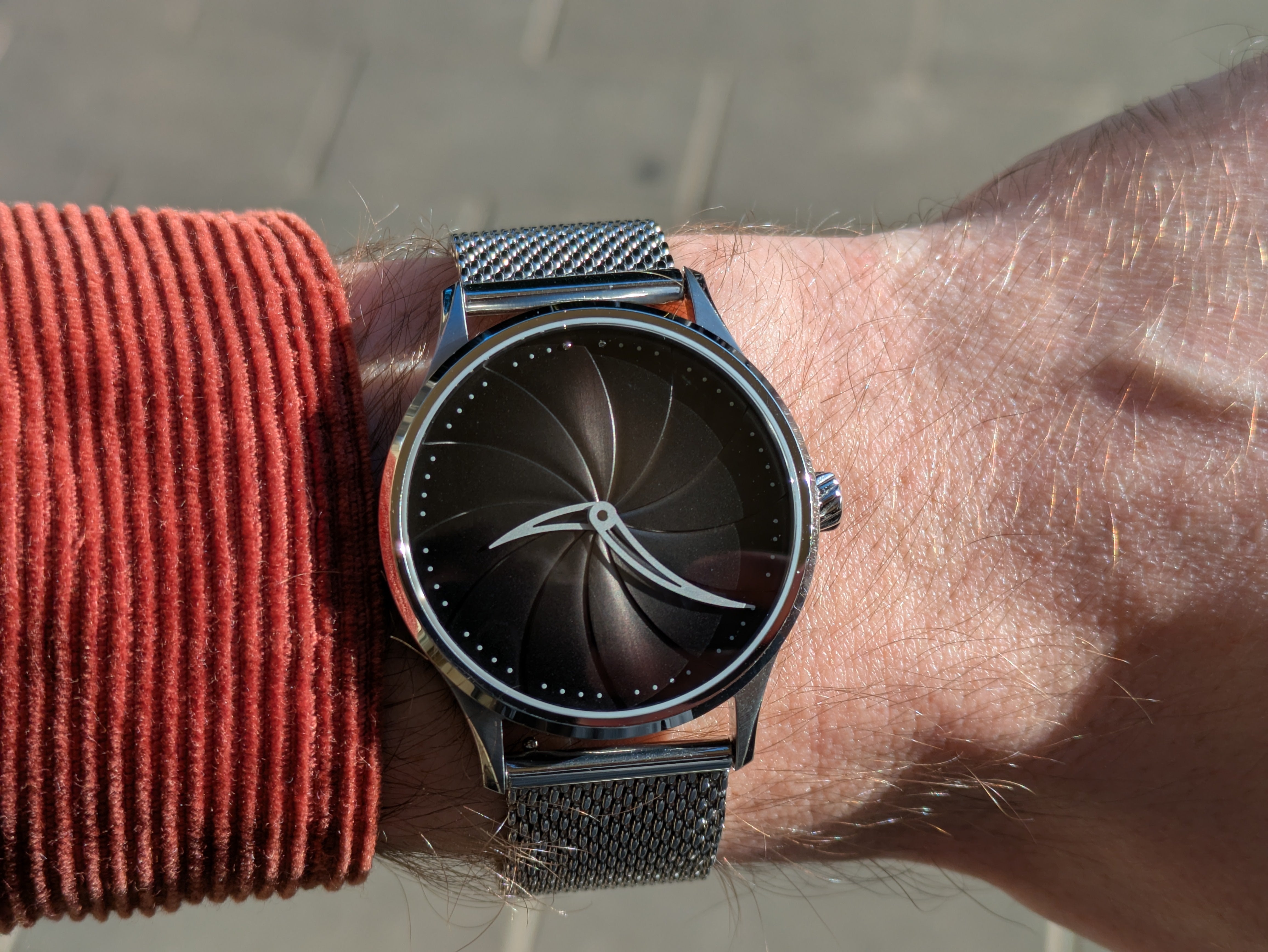 Each dial features a three-dimensional stamped spiral pattern, adding depth and texture that bring the surface to life. Every colour variant reflects light in its own way, revealing new character as it moves on the wrist.